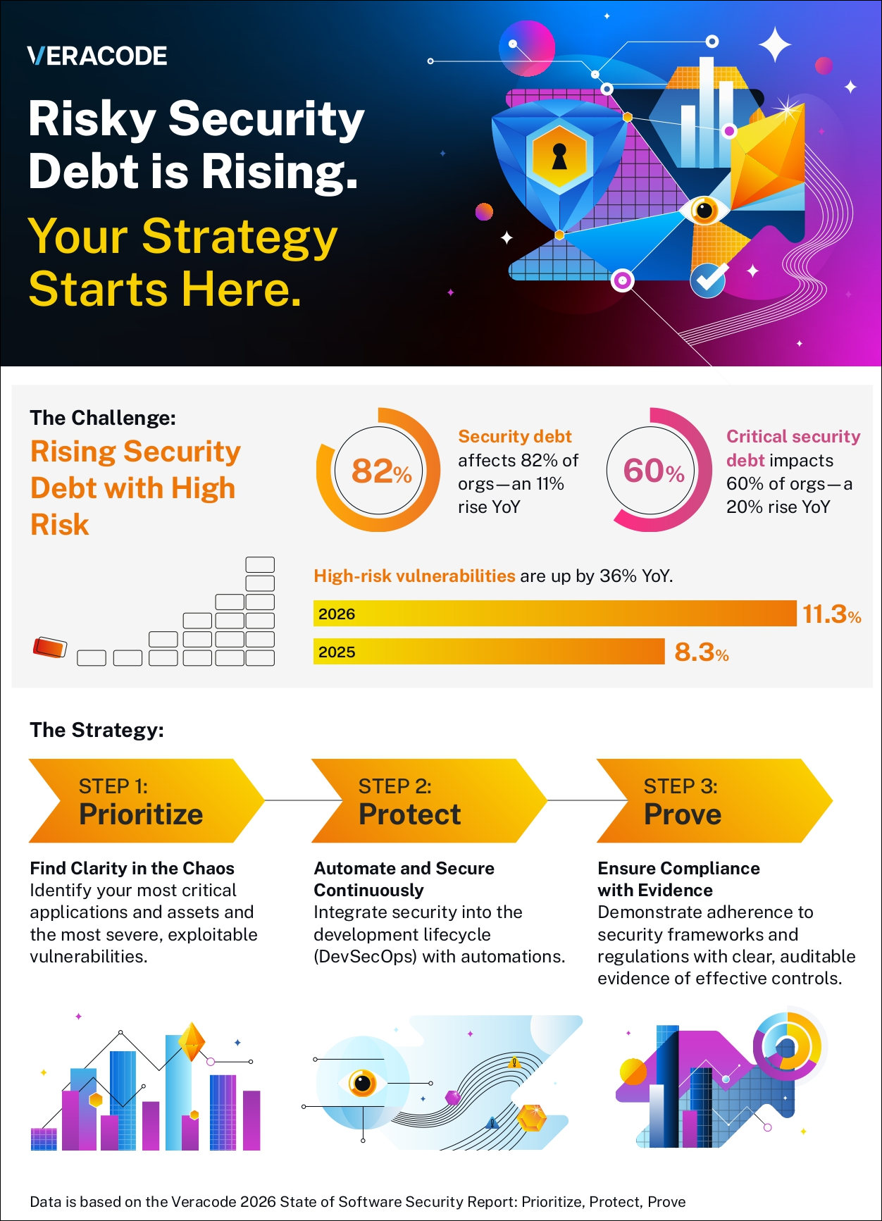 Get a snapshot of the key trends and strategies shaping the future of secure software development with the Veracode 2026 State of Software Security Infographic.