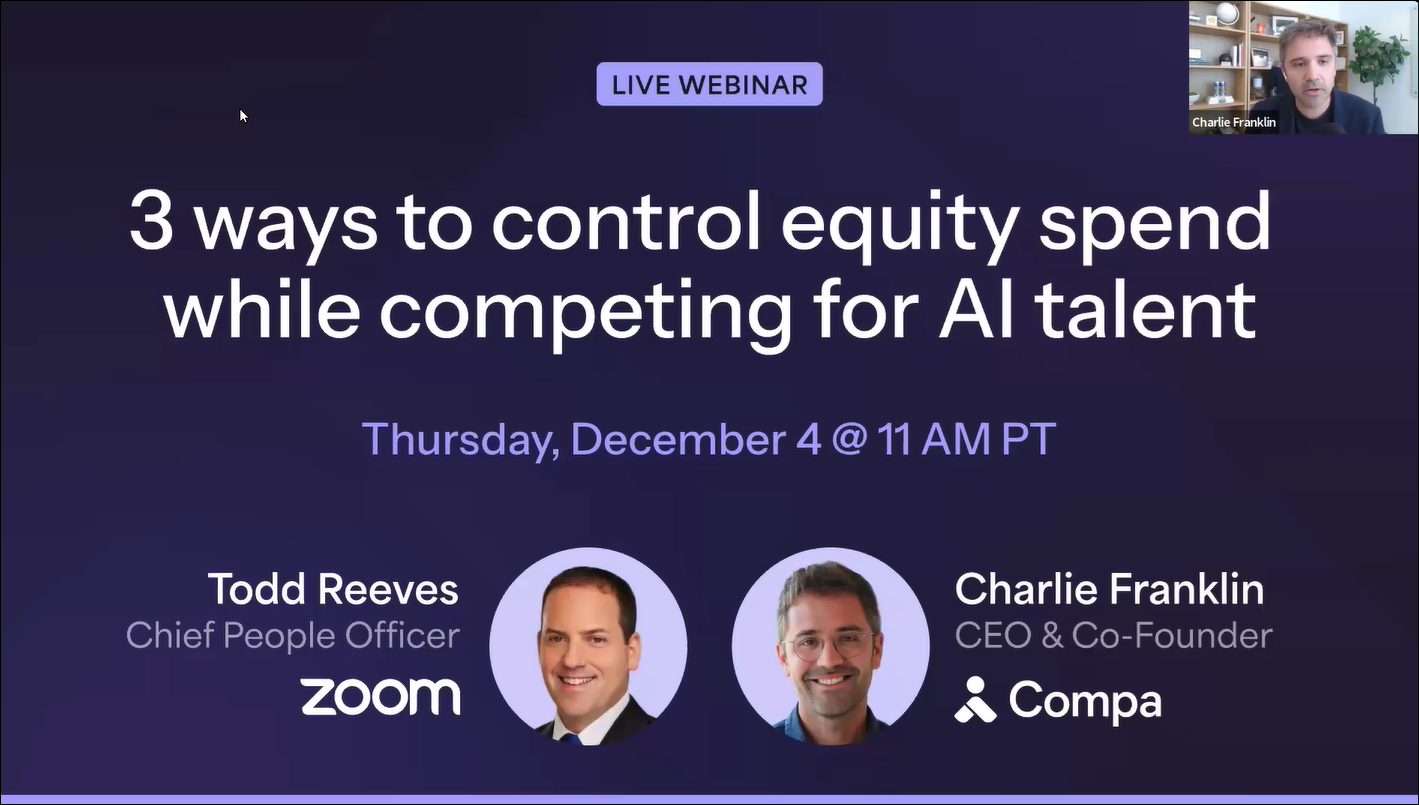Join Todd Reeves, Chief People Officer at Zoom and Charlie Franklin, Co-founder and CEO of Compa, to learn how real-time equity data helps comp teams plan with confidence, uncover participation gaps, calibrate grant levels, and align equity spend with business goals.