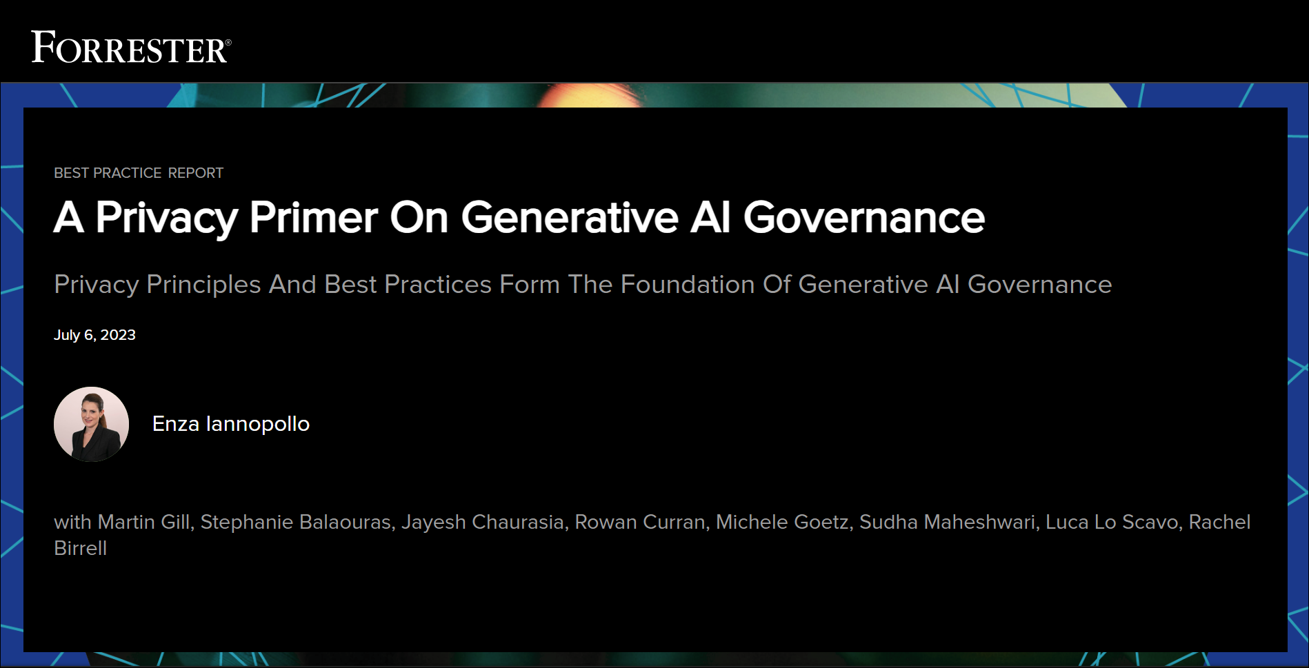According to Forrester, privacy principles and best practices will take your organization one step closer to the goal of leveraging generative AI more responsibly and ethically to build customer and employee trust. This report guides privacy and risk leaders through the key initiatives for generative AI governance that they must implement ahead of upcoming legislation.