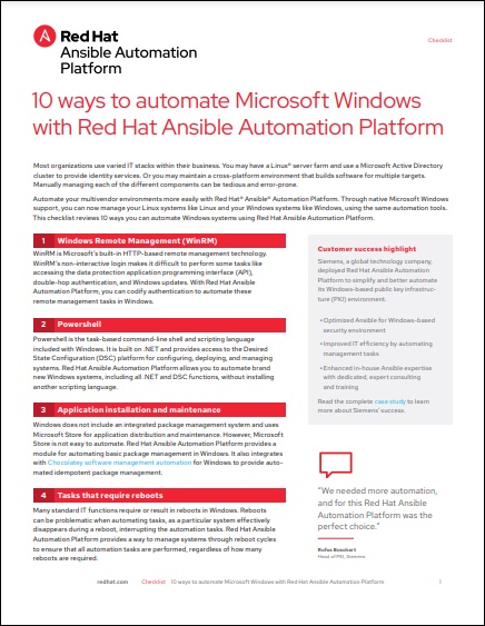 This checklist outlines 10 ways to automate Microsoft Windows using Red Hat Ansible Automation Platform, using the same management tools for automating Linux environments.