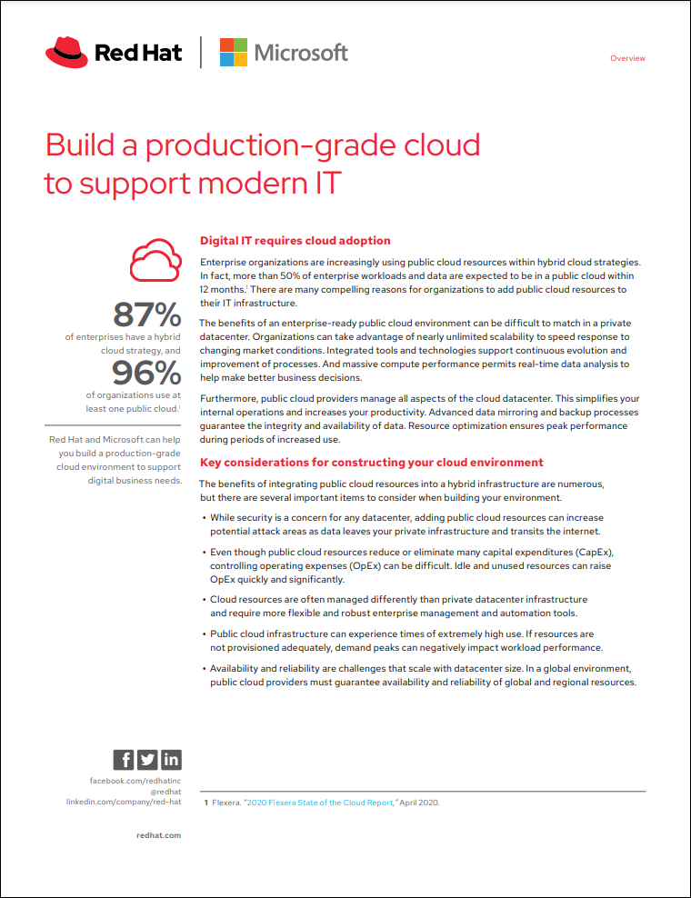 Enterprise cloud adoption is growing. Together, Red Hat and Microsoft deliver a production-ready cloud foundation that alleviates many of the challenges common in cloud infrastructure and hybrid migration.