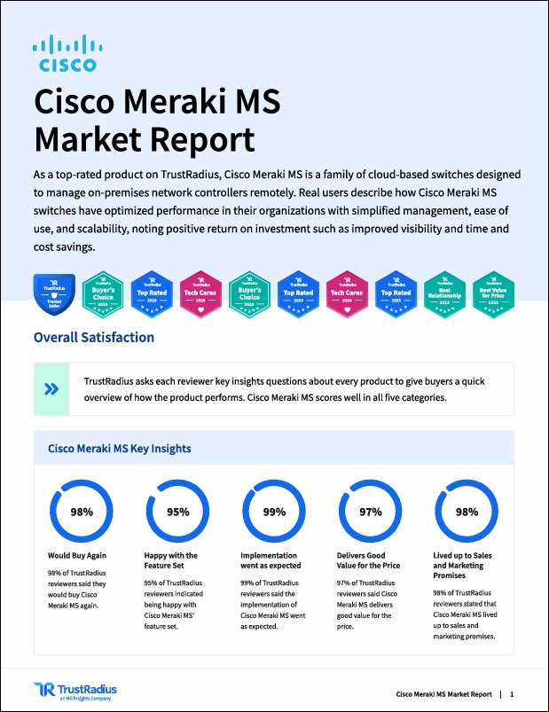 The right network solution can transform your IT infrastructure. A top-rated product on TrustRadius, Cisco Meraki MS is a family of cloud-based switches designed to manage on-premises network controllers remotely. Real users consistently describe how Cisco Meraki MS switches have optimized performance in their organizations with simplified management, ease of use, and proven scalability, noting positive return on investment.