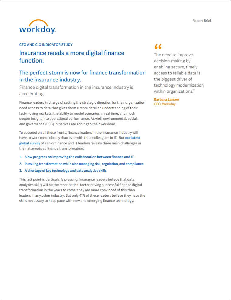 Start your insurance digital transformation journey. Outdated systems make it harder for finance leaders at insurance firms to set the strategic direction for their business. Read this report to learn how insurance finance leaders can partner with IT to access data that gives a full picture of fast-moving markets, model scenarios in real time, and gain deeper insights into operational performance.