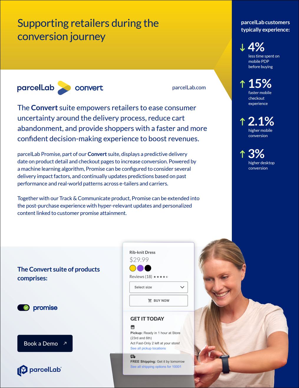 ParcelLab Convert provides a predictive delivery date that increases conversion rates, reduces consumer uncertainty, and improves customer satisfaction. Convert empowers retailers to ease consumer uncertainty around the delivery process, reduce cart abandonment, and provide shoppers with a faster and more confident decision-making experience to boost revenues.