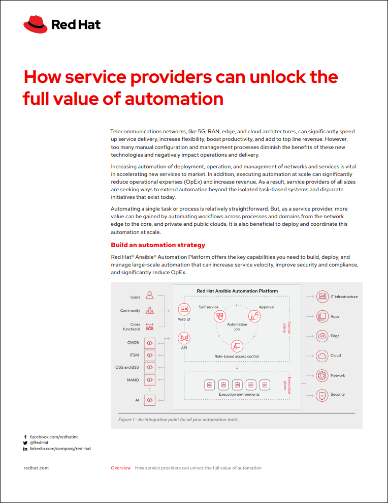 Increasing automation of deployment, operation, and management of networks and services is vital in accelerating new services to market. In addition, executing automation at scale can significantly reduce operational expenses (OpEx) and increase revenue. Read more about how Red Hat® Ansible® Automation Platform provides fully supported service provider capabilities.
