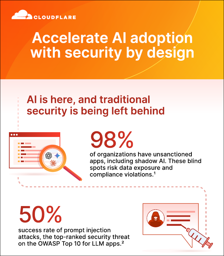 AI is here, and traditional security is being left behind. Experts say, that 98% of organizations have unsanctioned apps, including shadow AI. These blind spots risk data exposure and compliance violations. Download this infogaphic to learn how Cloudflare can secure your AI adoption.