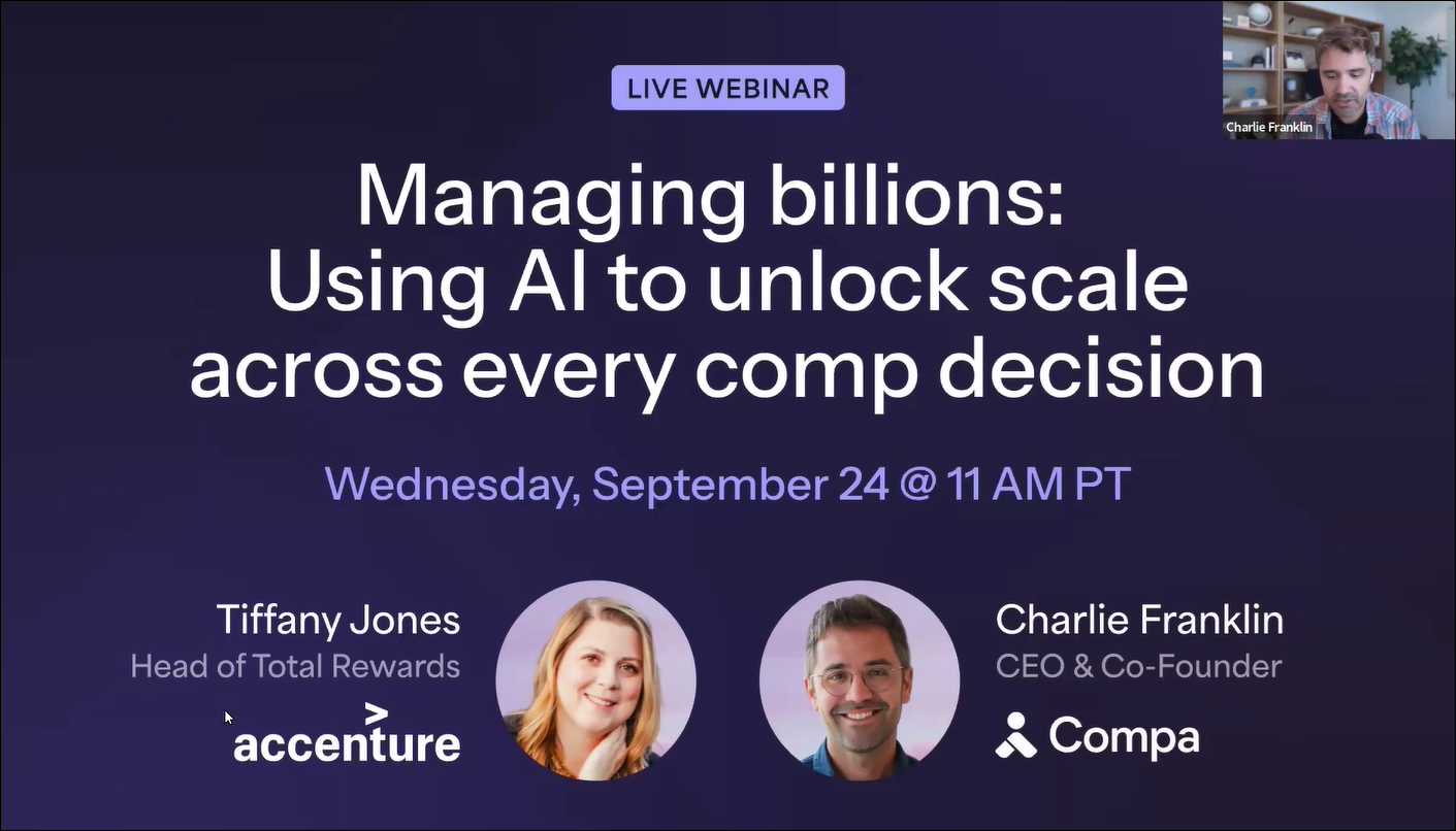 Hear from Tiffany Jones, Head of Total Rewards at Accenture, and Charlie Franklin, Co-founder and CEO of Compa, on how AI is changing the role of comp leadership and what every executive needs to know to stay ahead.