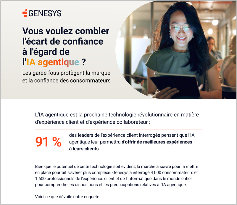 L’IA agentique s’impose comme l’avenir des interactions clients. Cependant, la confiance en ces outils reste fragile. Cette infographie révèle pourquoi la mise en place de mesures de sécurité n’est pas seulement un choix judicieux, mais une décision stratégique essentielle. Tirée d’une enquête mondiale menée auprès de 4 000 consommateurs et de 1 600 responsables de l’expérience client (CX) et du service IT, elle dévoile les tendances et les insights qui façonnent l’avenir de l’IA agentique.