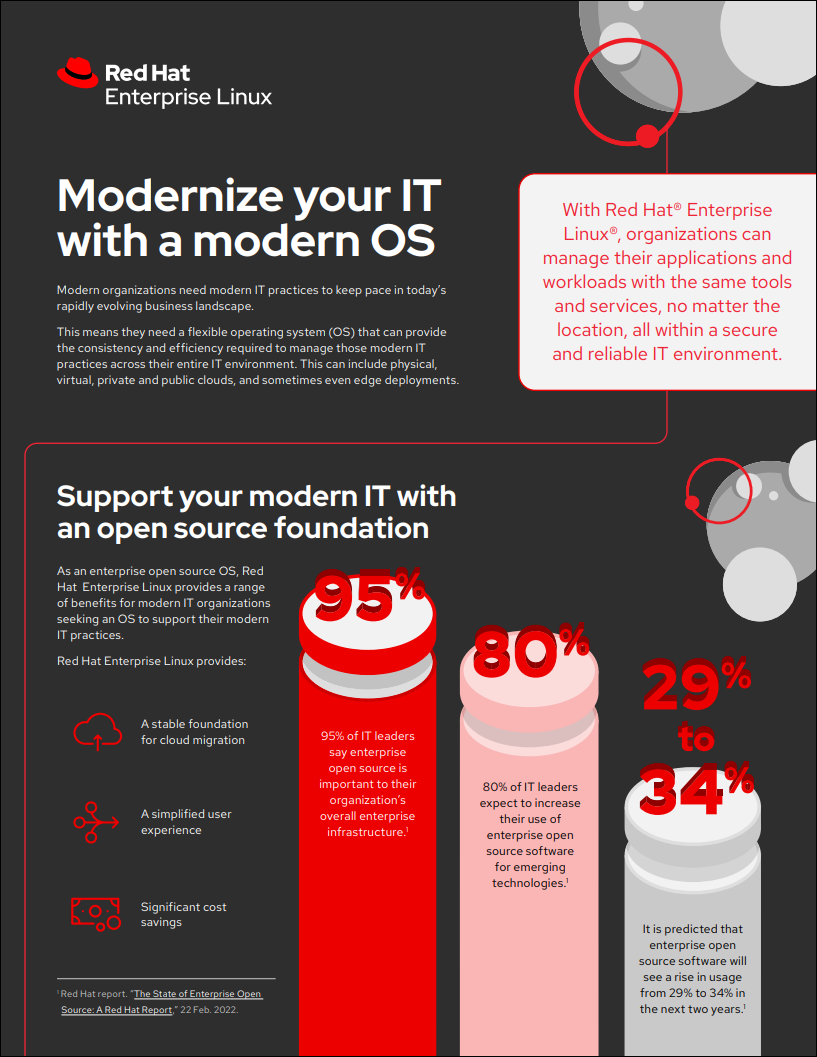 Modern organizations need modern IT practices to keep pace in today’s rapidly evolving business landscape.This means they need a flexible operating system (OS) that can provide the consistency and efficiency required to manage those modern IT practices across their entire IT environment. With Red Hat® Enterprise Linux®, organizations can manage their applications and workloads with the same tools and services, no matter the location, all within a secure and reliable IT environment.