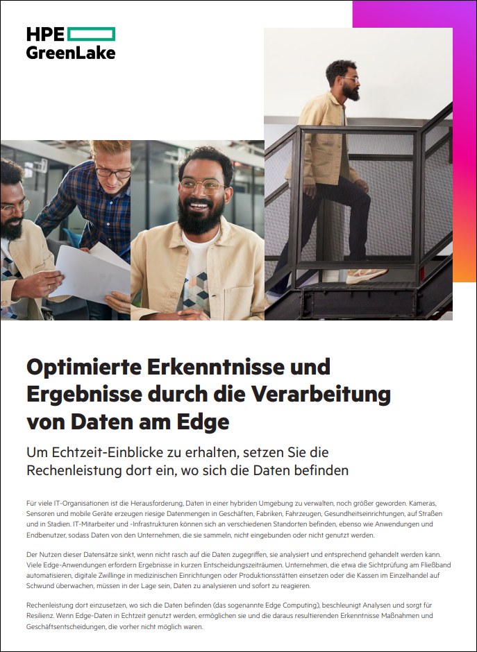 Verknüpfen Sie mit HPE GreenLake Daten in Ihrem verteilten Unternehmen, damit Sie Entscheidungen in Echtzeit im Tempo des Geschäftsbetriebs treffen können. Computing dort einzusetzen, wo sich die Daten befinden, sorgt für schnellere Analysen und mehr Resilienz. Erfahren Sie, wie Echtzeit-Einblicke am Edge den kontinuierlichen Betrieb von und bessere Geschäftsergebnisse für weit verteilte Krankenhäuser und medizinische Einrichtungen, internationale Hotels und große Sportstätten fördern.