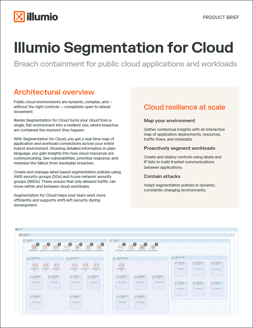 Contain cloud breaches faster with Illumio Segmentation for Cloud, delivering real-time visibility and Zero Trust enforcement to stop lateral movement across workloads.