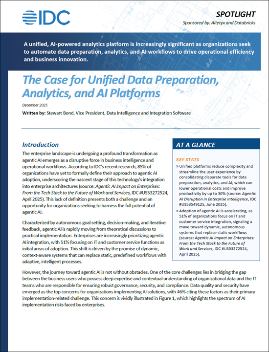 As agentic AI accelerates enterprise transformation, organizations need unified platforms to turn data into decisions faster. This IDC Spotlight Paper shows how AI-powered analytics platforms boost productivity, speed decision-making, and strengthen collaboration between business and IT. Learn how unified analytics supports scalable, governed AI adoption while reducing complexity and cost.