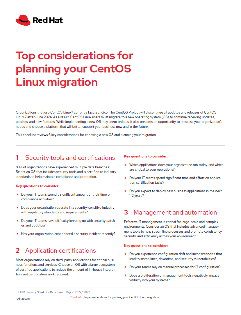 The CentOS Project will discontinue all updates and releases of CentOS Linux 7 after June 2024. As a result, CentOS Linux users must migrate to a new operating system to continue receiving updates, patches, and new features. Read this checklist to learn about 6 key considerations for choosing a new operating system and planning your migration.