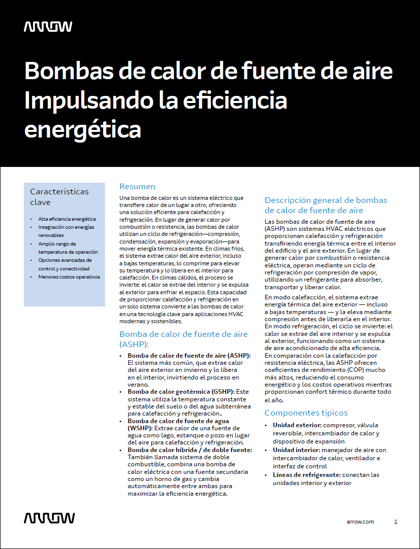 Este application brief ofrece una visión integral de las bombas de calor de fuente de aire (ASHP), resaltando su papel clave en el crecimiento del mercado de HVAC. Describe los principales impulsores del mercado, aborda desafíos de diseño y presenta tecnologías avanzadas de proveedores líderes que mejoran eficiencia, integración y escalabilidad. Conozca cómo Arrow y nuestros socios habilitan sistemas de climatización sostenibles y de alto rendimiento.